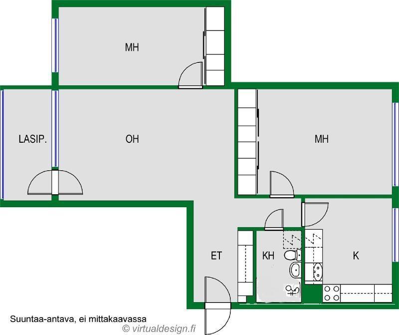 KeittiöJääkaappi/pakastin, kaapistot, sähköliesi, liesituuletin/ aktiivihiilisuodatin. ( Kaapinovet vaihdettu 2009)