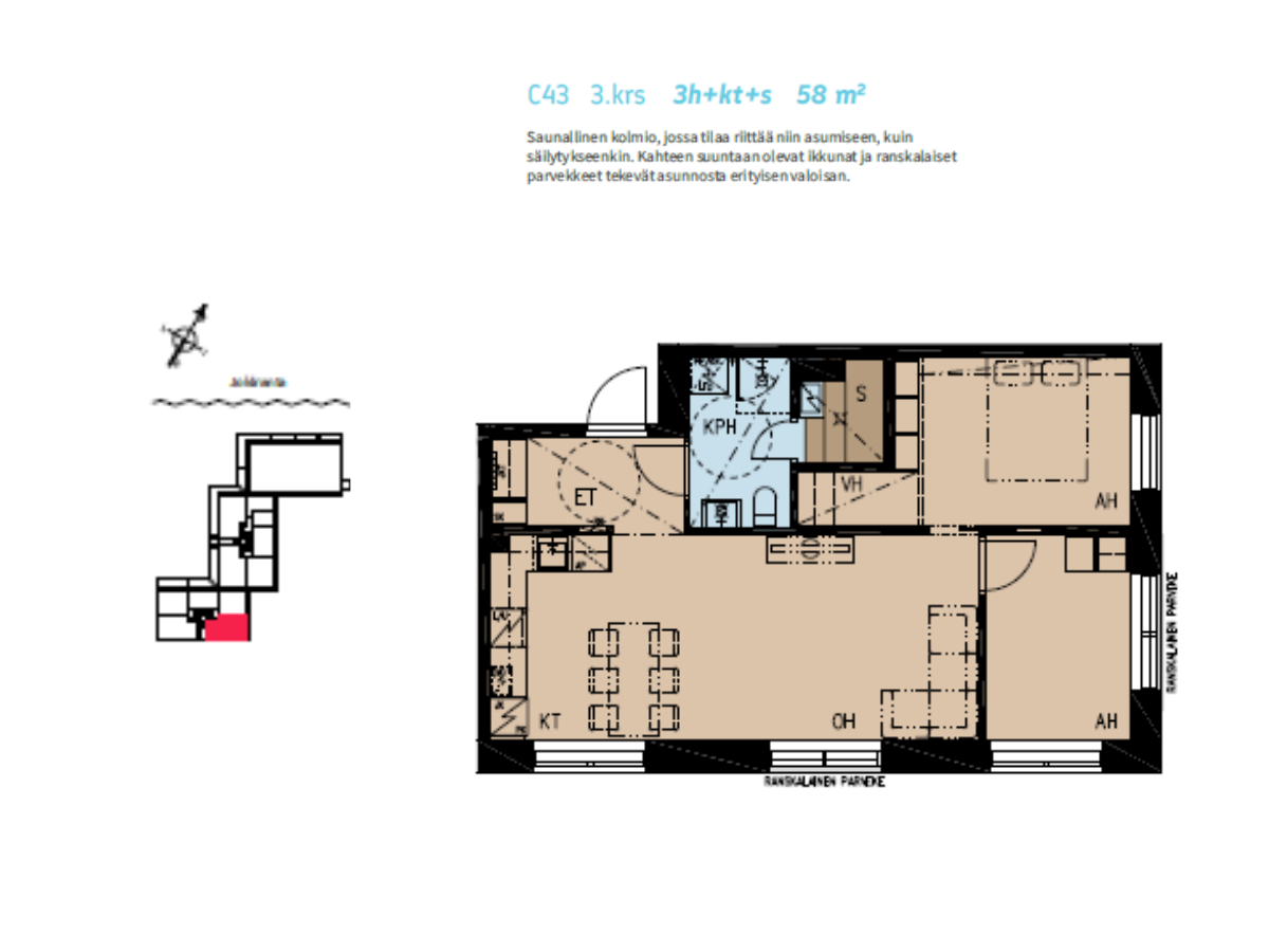 ENNAKKOMARKKINOINNISSA Saunallinen kolmio, jossa tilaa riittää niin asumiseen, kuin säilytykseenkin. Kahteen suuntaan olevat ikkunat ja ranskalaiset parvekkeet tekevät asunnosta erityisen valoisan. Pielisjoen jokivarsi tarjoaa ainutlaatuisen ympäristön, jossa kaupunkielämä ja luonnon rauha yhdistyvät harmonisesti. Penttilän Isla tarjoaa korkealuokkaista asumista modernissa kuusikerroksisessa talossa, jossa yhdistyvät laadukkaat materiaalit, nykyaikaiset ratkaisut ja erinomainen sijainti. Taloyhtiössä on oma autohalli yhteiskäytössä Asunto Oy Kostin kanssa sekä yhteinen rantasauna, josta avautuu rauhoittava jokimaisema. Pihakannelta on suora kulku rantaraitille ja Cederbergin aukiolle – kaupungin ja luonnon parhaat puolet kohtaavat täällä. Asunnot ovat nyt varattavissa ennakkomarkkinoinnin aikana – tutustu asuntoihin ja varaa omasi. Jätä yhteystietosi tai ota meihin yhteyttä, niin lähetämme sinulle kohteen esitteen ja lisätiedot. Tärkeää tietoa kohteesta - Kohde ei ole RS-kohde. - Asuntokaupat tehdään vasta kohteen valmistuttua ja lopputarkastuksen jälkeen. - Arvioitu valmistuminen 15.12.2025 mennessä. - Kohteessa ei ole yhtiölainaa. Ota yhteyttä Kiinteistömaailma Joensuu p. 013 222 500 • joensuu@kiinteistomaailma.fi